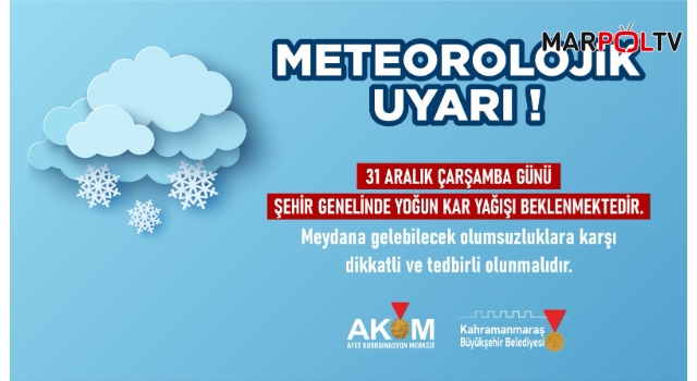 Kahramanmaraş Büyükşehir Belediyesi Afet Koordinasyon Merkezi (AKOM), 31 Aralık Çarşamba günü şehir genelinde etkili olması beklenen yoğun kar yağışı ve soğuk hava koşullarına ilişkin vatandaşları uyardı. AKOM’dan yapılan açıklamada, meteorolojik verilere göre kar yağışının il genelinde kuvvetli şekilde etkili olmasının beklendiği, hava sıcaklıklarının ise yer yer -10 dereceye kadar düşeceğinin öngörüldüğü belirtildi. Açıklamada, özellikle gece ve sabah saatlerinde buzlanma riskinin artacağına dikkat çekildi. Olası olumsuzlukların önüne geçmek amacıyla Büyükşehir Belediyesi ekiplerinin tüm hazırlıklarını tamamladığı vurgulanırken, yol açma, tuzlama ve kar küreme çalışmalarının mesai mefhumu gözetilmeksizin sürdürüleceği ifade edildi. Vatandaşlardan kar yağışı ve buzlanma nedeniyle yaşanabilecek risklere karşı dikkatli ve tedbirli olmaları istendi. Öte yandan, kış şartlarıyla mücadele kapsamında yaşanabilecek her türlü aksaklık ve taleplerin ALO 153 Çağrı Merkezi ile 112 Acil Çağrı Merkezi üzerinden ilgili birimlere iletilebileceği bildirildi.