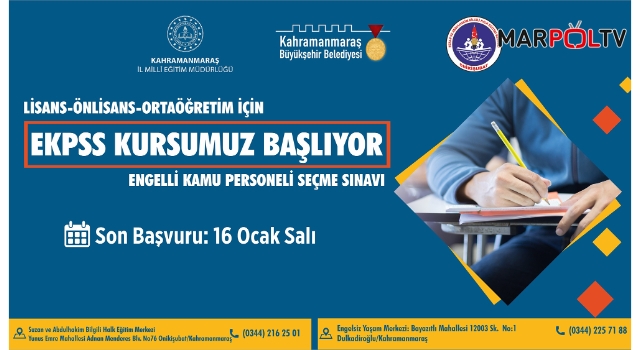 Sosyal belediyecilik çerçevesinde daima vatandaşın yanında olan, Başkan Hayrettin Güngör öncülüğünde sosyal desteklerini artırarak sürdüren Kahramanmaraş Büyükşehir Belediyesi, özel gereksinimli bireylere yönelik Engelli Kamu Personeli Seçme Sınavı (EKPSS) kursu düzenleyecek. İl Milli Eğitim Müdürlüğü ve Onikişubat Suzan ve Abdulhakim Bilgili Halk Eğitimi Merkezi iş birliğiyle ortaöğretim, önlisans ve lisans mezunlarına yönelik ücretsiz olarak düzenlenecek kurslara https://kahramanmaras.bel.tr/duyuru/2024/01/03/ekpss-kursu-on-kayit-basvuru-formu internet adresinden çevrimiçi başvuru yapılabilecek. 16 Ocak Salı gününe kadar devam edecek başvurulara ve kurslara ilişkin detaylı bilgiye 0344 225 71 88 ve 0344 216 25 01 numaralı telefonlardan ulaşılabileceği belirtildi.