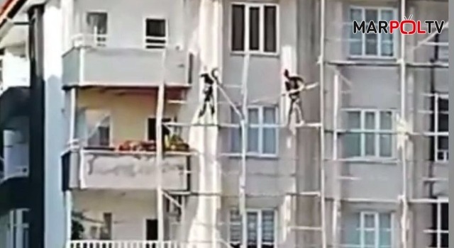 Kahramanmaraş’ta bir apartmanın dış cephesi için kurulan iskelede çalışan işçilerin, güvenlik önlemi alamadan hareket etmeleri yürekleri ağza getirdi.