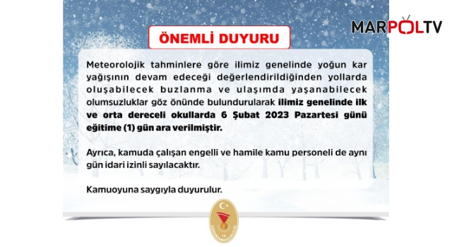 Kahramanmaraş Valiliği tarafından tapılan yazılı açıklamada; “Meteorolojik tahminlere göre ilimiz genelinde yoğun kar yağışının devam edeceği değerlendirildiğinden yollarda oluşabilecek buzlanma ve ulaşımda yaşanabilecek olumsuzluklar göz önünde bulundurularak ilimiz genelinde ilk ve orta dereceli okullarda 6 Şubat 2023 Pazartesi günü eğitime (1) gün ara verilmiştir.Ayrıca, kamuda çalışan engelli ve hamile kamu personeli de aynı gün idari izinli sayılacaktır.Kamuoyuna saygıyla duyurulur” ifadelerine yer verildi.